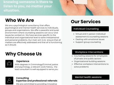 We are a psychological consultancy that offers psychological and mental health services to individuals, groups and organizations. We offer a peaceful and quiet environment where counseling sessions can occur and issues be worked on. We have services specific to the indivudal and organizational level to solve interpersonal and personal problems. Our main aim is to ensure that all matters are effectively addressed and that all is functioning as it should. Tags: Mental health, therapy, therapist, psychology, guidance counseling, advice, workplace intervention.
